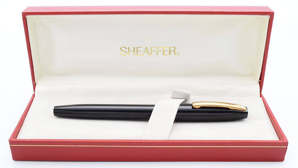 Condition New old stock in box, with no cracks, chips, dents, or dings. This is a velvety black, shiny pen in a classic design. The section has some marks. The barrel and cap have some light marks picked up in storage, but look more or less brand new. The 3/8" wide gold cap band has polishing marks. The clip has a tad of plating wear around the perfect white dot. The imprint is clear.
