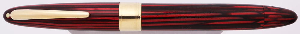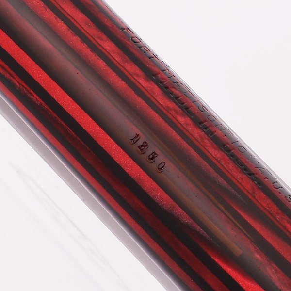 Condition Excellent + condition with no cracks, chips, dents, or dings. This is a chubby, beautifully colored and striated, shiny pen in a classic design pattern. The cap and barrel have light overall scratching. The cap has a few long, thin scratch marks. The cap band has light to some moderate microscratching. The clip has light microscratching, some tiny dot scratches, and a bit of plating wear along the upper edge. The white dot is perfect. The imprints are clear.