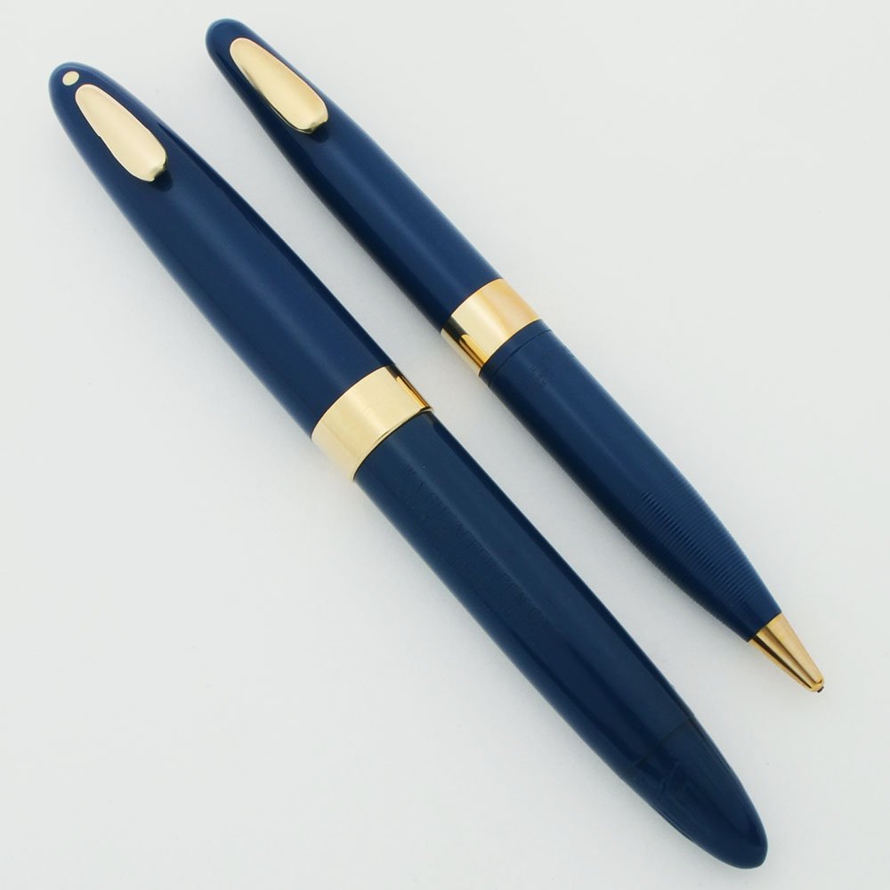 Color Persian blue bodies with gold plated trim (both have a 1/4" trim band and a 1/2" clip). Yhe pen has a black section and a white dot.