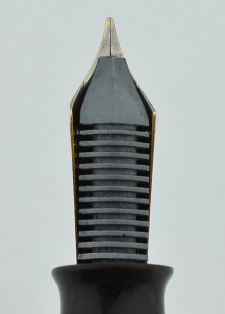 Nib FINE. 14k with masking, serial number, grey colored feed.