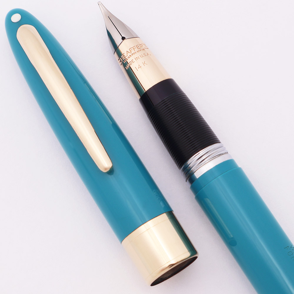Color Peacock blue with gold plated trim, a 3/8-inch wide cap band, and a white dot above the clip. Peacock is one of the hard-to-find colors considered highly collectible.