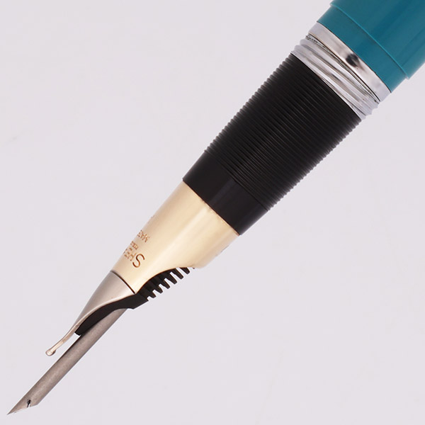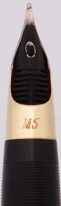 Nib MEDIUM two-tone Triumph 14k nib, marked M5 on the back. It's smooth and firm with excellent tipping material. The masking is in lovely condition with no wear apparent.