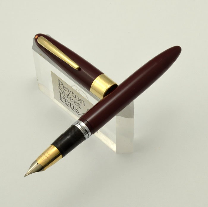 Excellent condition with minor signs of normal use, and it has excellent functionally. No cracks or bite marks, just hand and desk wear. The gold plated trim is excellent with no brassing and only light scratches. The white dot is a little blurry around the edges ... we've seen that happen with burgundy Sheaffers from this era before. The filling system takes in and expels liquid strongly. We will guarantee it for a period of one year. |