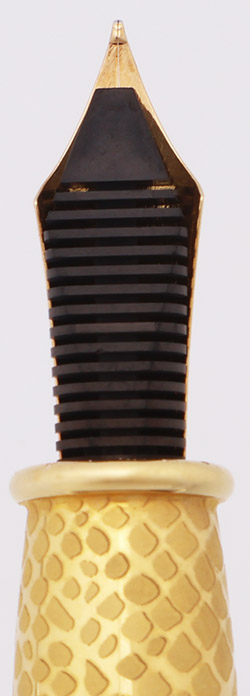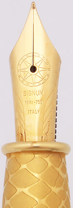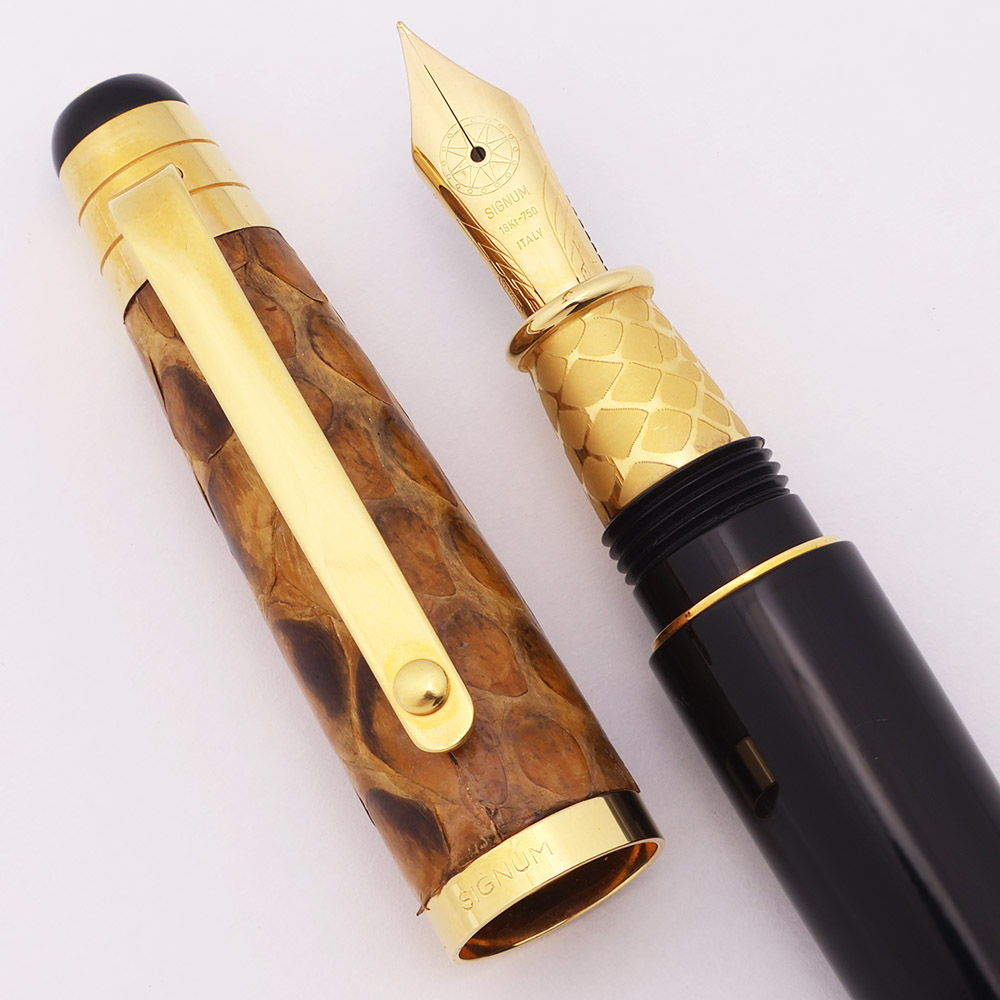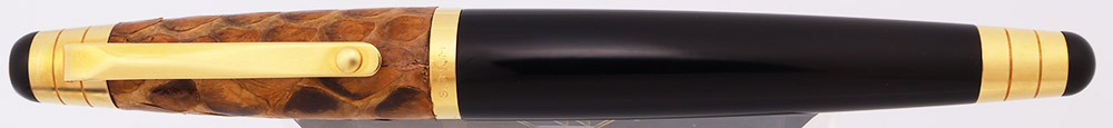 Condition Excellent + condition. There is light to moderate scratching on the barrel. The section, with its cool python print, looks fantastic. The clip looks good. There is microscratching on the metal rings at the top of the cap. The cap band has some microscratching and hints of glue on the upper edge. The python skin python skin looks great - there are some raised edges in places, but it doesn't seem like it's flaking off. It ships in a Signum box and outer cardboard box. The surface of the box is damaged (a bit gummy feeling) and peeling away.
