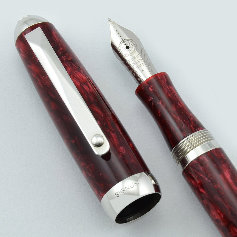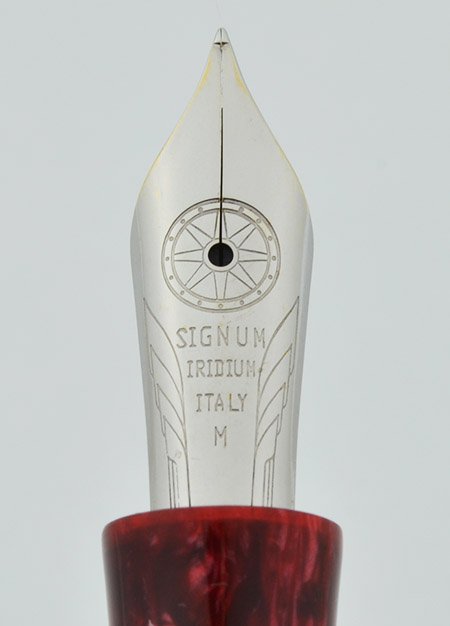 Nib Steel Medium Nib, there is a "M" denoting the nib on the sterling trim of the cap as well as on the nib itself. The nib is imprinted with the chariot wheel logo of Signum.