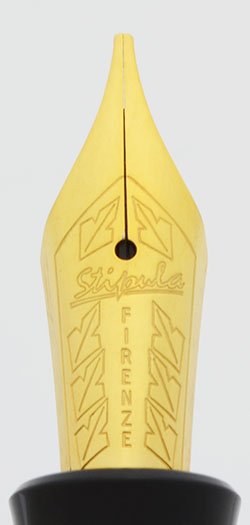 Nib 1.1mm gold plated steel nib. This is a factory italic nib and will write a bit like a cursive italic. JoWo calls this type of nib a cursive calligraphy nib but we don't know who made this one.