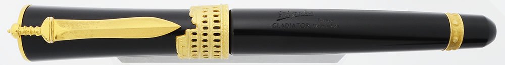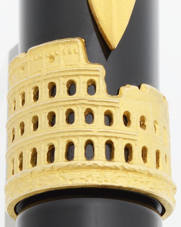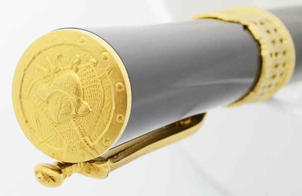 Color Black resin with matte gold plated trim. The clip is a sword and there is a shield at the end of the cap. The cap band is wide and carved like the Roman Colosseum. There is a leather belt patterned band at the end of the barrel..