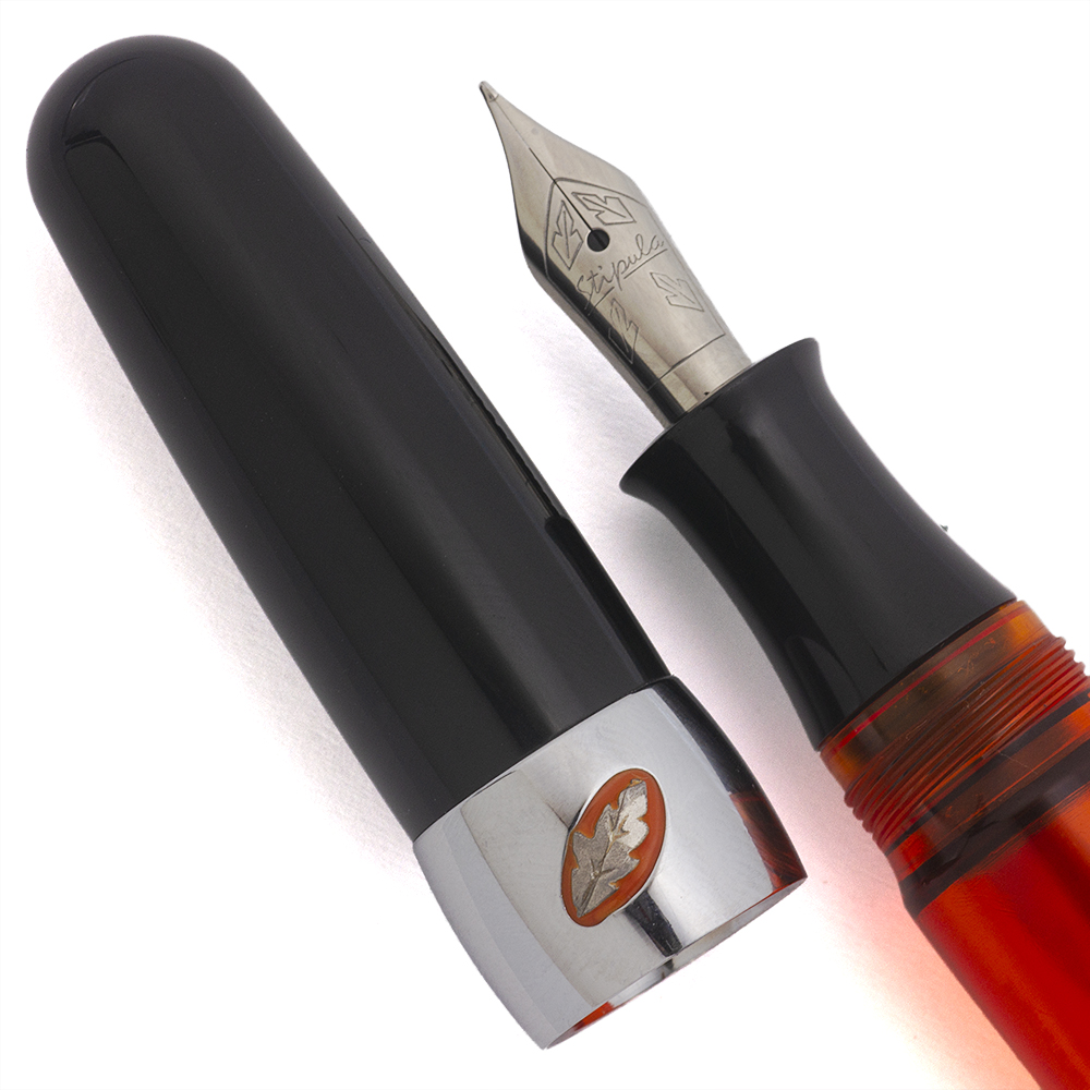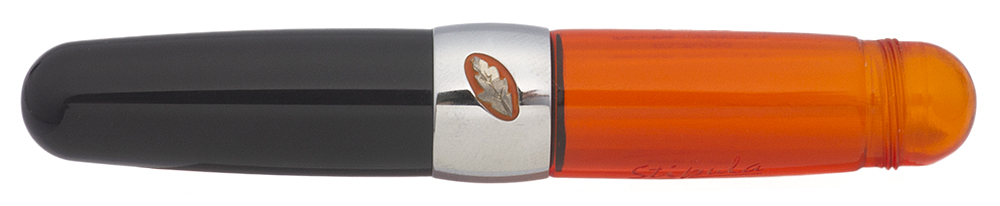Color Hand turned Italian resin. "Miami Sunset" barrel which is a clear orange color and velvety black cap and section with chrome trim. The fountain pen cap fits onto the end of the barrel when in use, which makes it more comfortable in the hand. The trim band is wide and has the Stipula leaf.