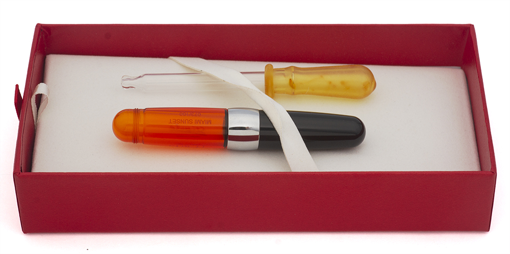 Condition Near mint condition, in box, with paperwork, cartridge, and eye-dropper, and with no cracks, chips, dents, or dings. This is a short, bullet-shaped limited edition (#73/100) fountain pen that features a glowing orange barrel (Miami Sunset). To the best of our knowledge, it has never been inked. The orange barrel has excellent clarity. There seems to be some scratching on the inside but this could just be a feature of the material used. The cap has a few light microscratches. The wide cap band looks great and the Stipula leaf has a nice orange backing that shows around the edges. The imprints are clear.
