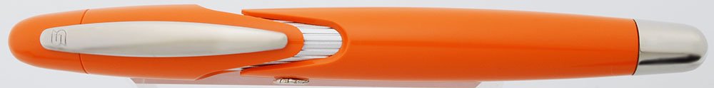 Color Orange resin pen with chrome trim and section. The section is slitted to hold the cap in place, but it's also magnetic. The cap does not have contact with the orange parts of the barrel to create an "S" shape out of the exposed section.