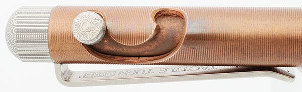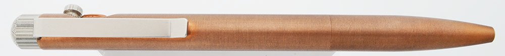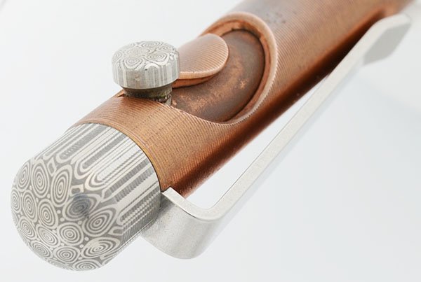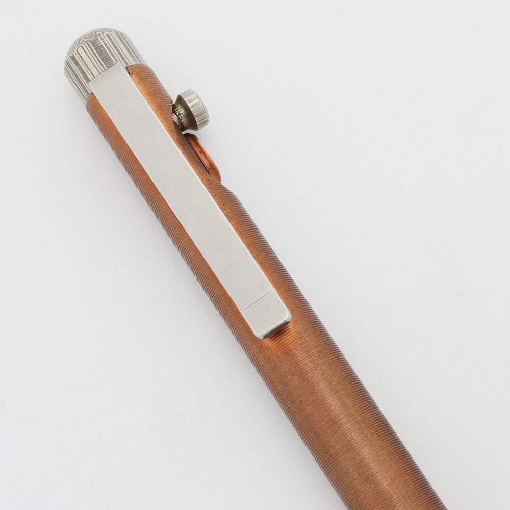 Color Made of grooved copper with stainless steel clip and Damasteel, a Damascus steel patterned stainless steel, cap piece and bolt. Machined from 145 copper, aka Tellerium copper, known for its natural antimicrobial properties.