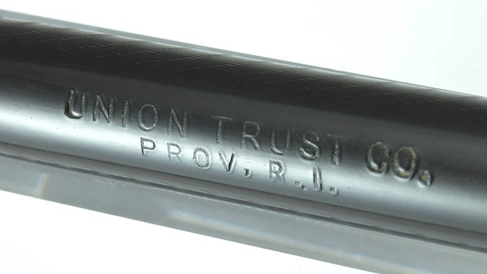 Manufacturer and Year Marked "Union Trust Company, Prov. RI" but that may have been a business personalilzation. We guess the pen was made by one of the big pen makers than made a lot of unbranded pens, such as Aiken Lambert. The cap has the "Unscrew" and hand icon which we've seen elsewhere.