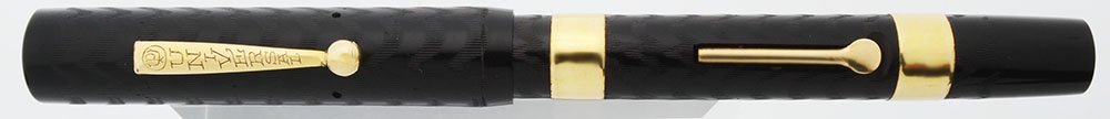 Color Black chased hard rubber, BCHR. The barrel has two 1/4" wide gold filled bands. The pen also has a gold filled clip.