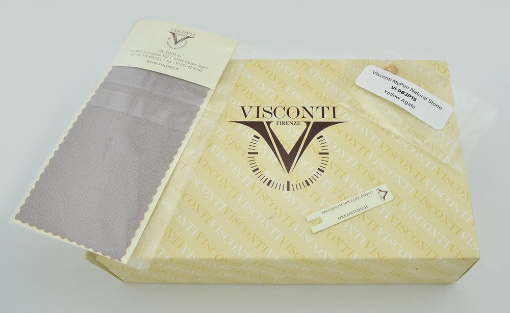 Color Black basaltic lava with bronze colored trim. This material has some interesting characteristics: flame-proof, very hard and almost unbreakable, moisture absorbing. This model had the "MyPen" customization feature, and a yellow agate jewel has been installed in the top of the cap. We also provide you with the original metal jewel.