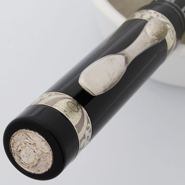 Condition Excellent condition, working well. Light handwear and scratching all over. The plating on the clip is worn down, giving it a somewhat dull appearance. The decorative bands on the cap also have plating wear and pitting. There is a scratch on the cap lip, and we've included a closeup of this area in the photos. The detailed engraving on the barrel looks fantastic. The emblem in the top of the cap also has pitting. The imprints are clear. The pen comes in a Visconti box, but it is not the box that the pen originally came in.