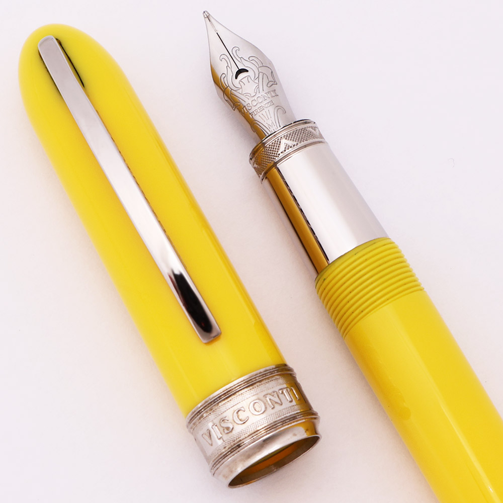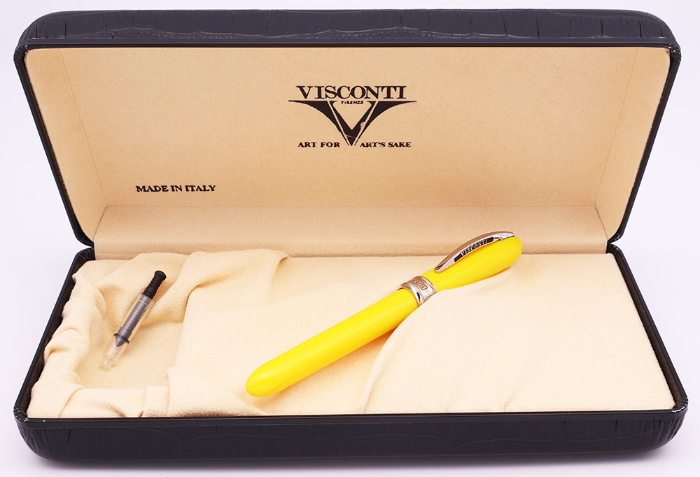 Condition Excellent condition in box. There is some very light handwear and microscratching visible under magnification, though it's difficult to spot in hand. The top of the cap and end of the barrel have small cracks and chips. The cracks at the top of the cap have some ink stains. There is also some staining around the top of the clip. The cap band has some patina, but no brassing or plating wear. The nib collar has some hints of corrosion around the edge. The trim looks great, with just a few tiny scratches. No brassing or plating wear. Ships in Visconti box, with a booklet under the pen tray. The outer surface of the box is in good condition, with no cracking or peeling.