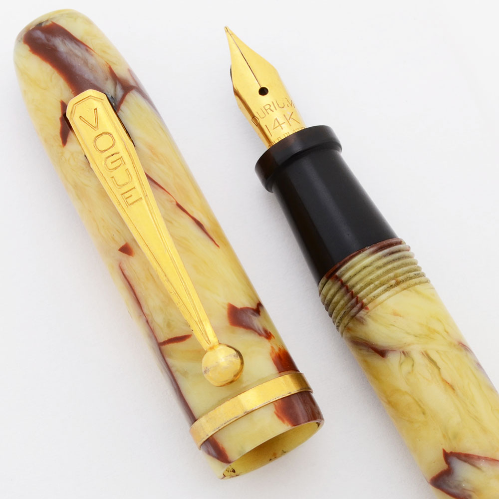 Color Ivory (with a yellowish tinge) with red veins with gold plated trim. Single cap band. The clip includes the VOGUE branding.