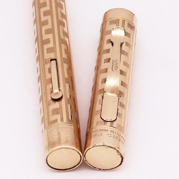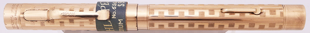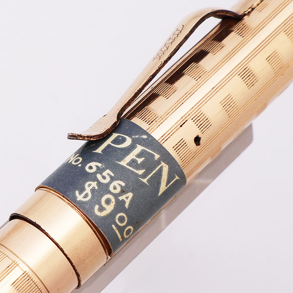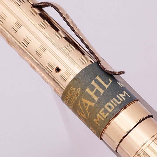 Condition Excellent + condition. There is a paper band on the cap, indicating the model number, which matches information from the page linked above. The section has some plating wear around the front edge. Both ends of the barrel have marks from the cap lip. The patterned portion of the cap and barrel looks good, with primarily just microscratching, and some scattered spots of pitting. The lever has plating wear along the sides. No dents or dings on the cap and barrel. The cap lip has some touches of plating wear. The clip has some dots of plating wear around the edges. The cap imprint is clear.