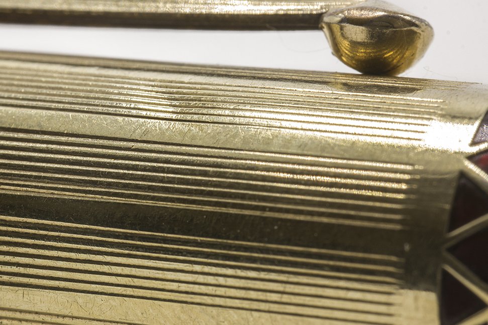 Color xxxGold filled with red ("dubonnet") pyralin (plastic) inserts.