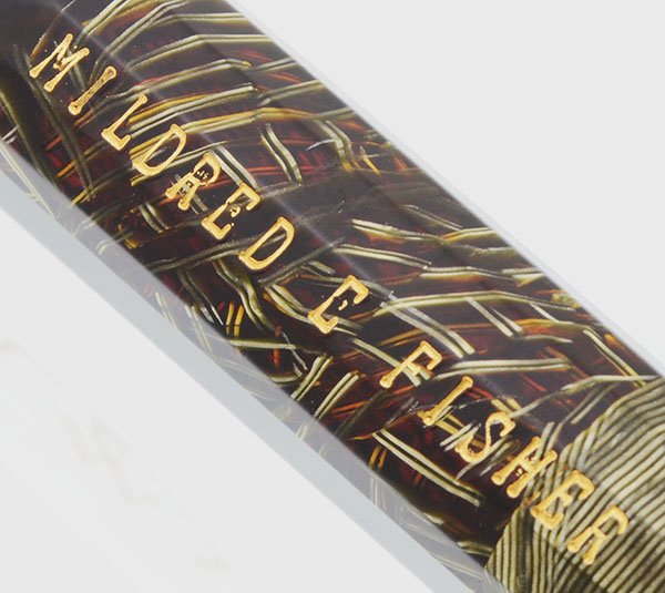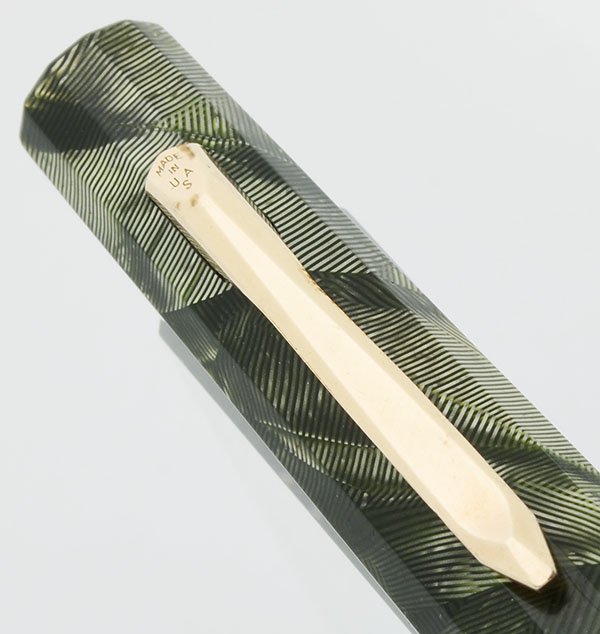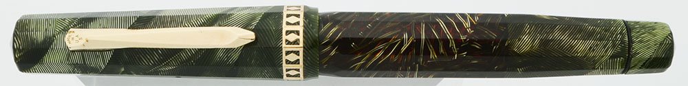 Condition Excellent condition. The green color is great as is the transparency of the viewing section. There is brassing on the clip, but the cap band looks good, and the cap imprint is clear. The pen is personalized "Mildred E Fisher". No cracks, chips, or dents. The pen is fully restored and working well.