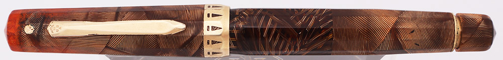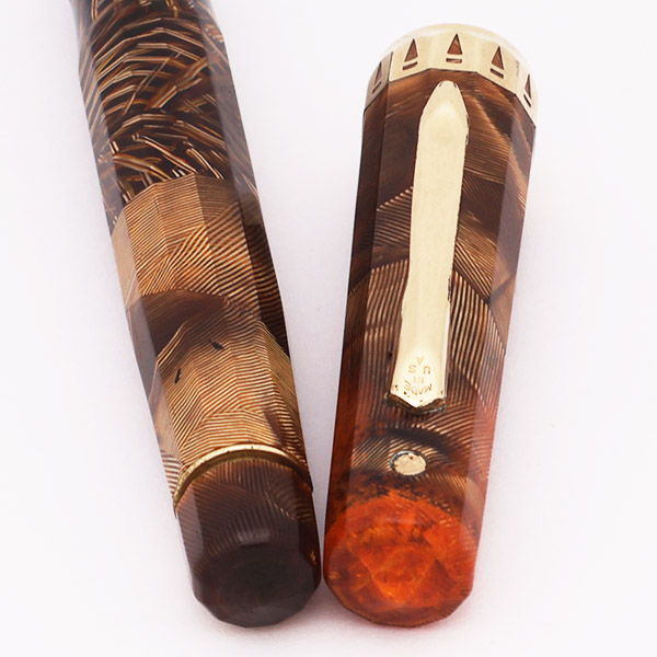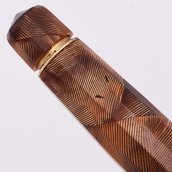 Condition Excellent condition with no cracks. The barrel looks good, has nice amber transparency, with just some light scratching. The cap has light scratching, and the material near the top of the cap has turned orange due to the celluloid aging and lost some transparency. The beautiful cap band has microscratching. The clip has microscratching and some plating wear along the sides.