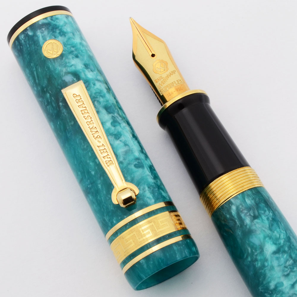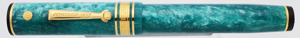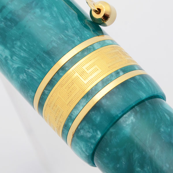 Color Jade Green. It has a pearly marbled blue-green material, not like the vintage jade color. The trim is gold plated with a jeweler's band of stacked coins beneath the section and a Greek key patterned band near the cap lip. There are matching Greek key patterns on the metal tube of the pneumatic filler. The section and end pieces are black.