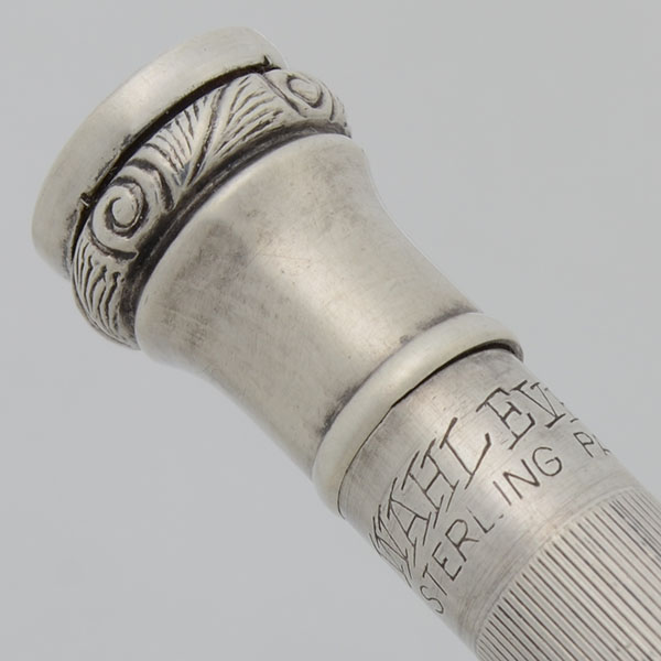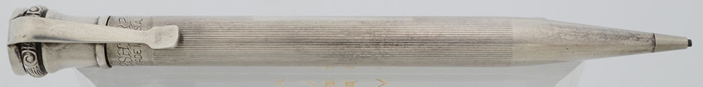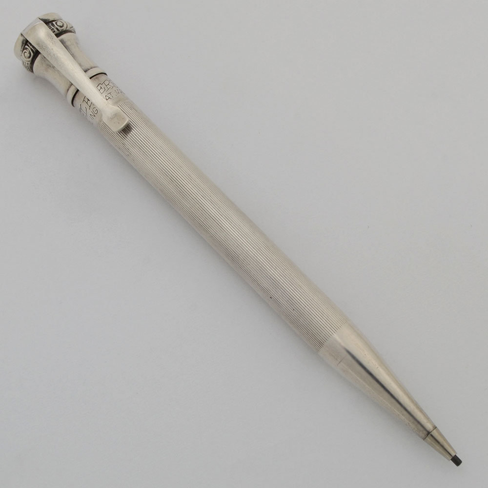 Color Sterling finish with a lined pattern. The twist mechanism has a 1/16" ornate band. Plain, short clip.