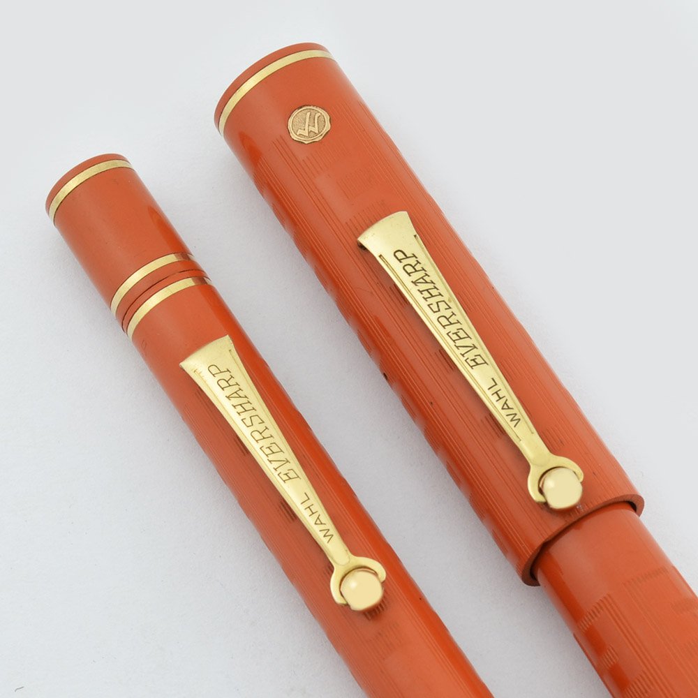 Condition Very nice condition, excellent except for the fact that the cap lip was reduced/shortened, no doubt to remove a crack. We have priced the set accordingly. There's some damage, minor scratching on the cap and barrel of the pen, a few tiny dots of dark color on the barrel, and a tiny chip on the inside of the cap lip (see photos). The pencil also shows some light scratching and a small scuff on the upper barrel opposite the clip. The trim on both pieces is in nice condition, with just some very light scratching but no brassing visible. They're very weighty and solid feeling, and the imprints and patterning in the hard rubber remain crisp. The original box is a little worn, but quite attractive. No cracks or personalization