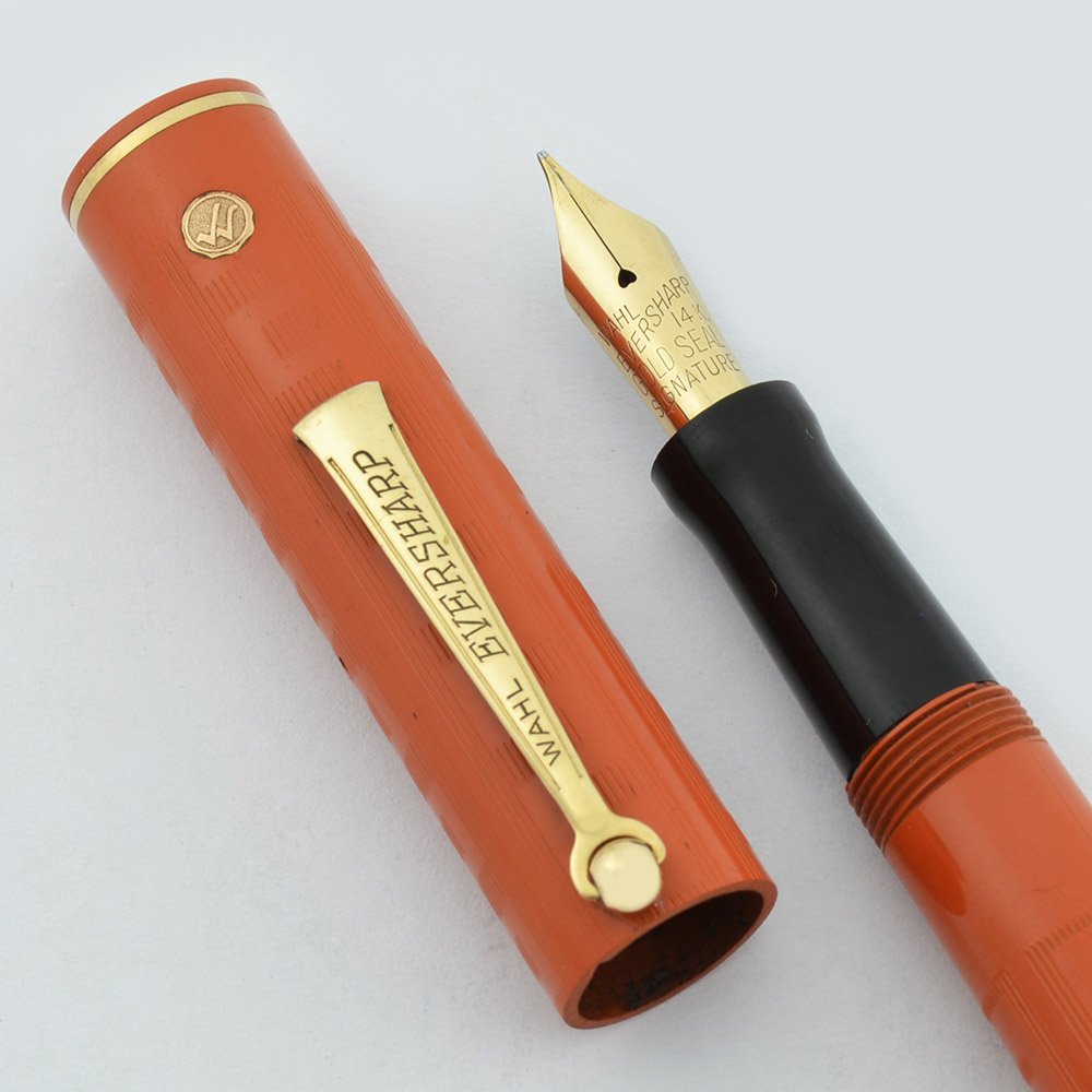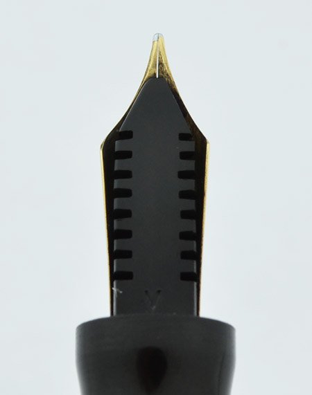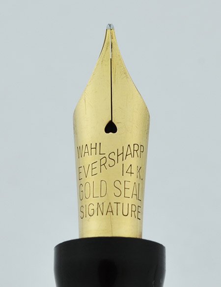Nib SEMI-FLEX FINE Eversharp Gold Seal nib is 14k. It's smooth with nice tipping remaining. The feed is marked with an M, but this nib writes more like what we would call a fine. It's got a little flex to it, and with a little pressure the line will vary from fine to broad.