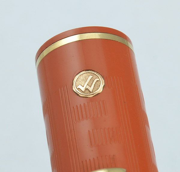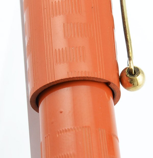 Color Orange hard rubber in the greek key finish with gold plated trim.