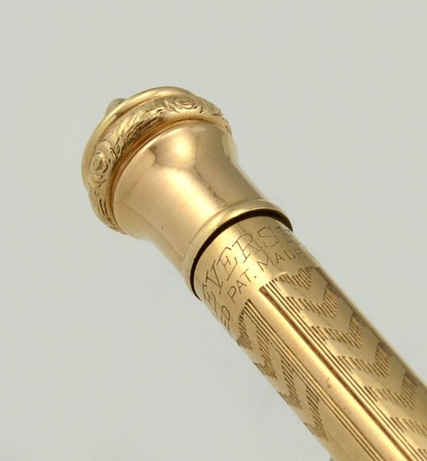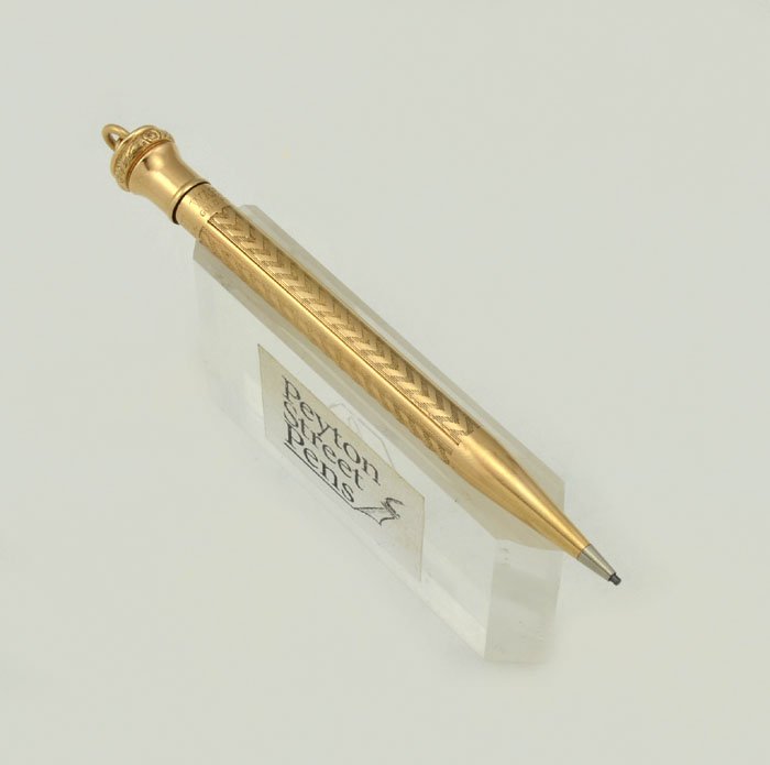 Condition | Excellent condition. There appears to be no pitting or damage to the finish at all on this pencil, although there are some tiny, shallow indents in the chrome tip, as if someone tapped on it with a needle's point. Also, the very top of the pencil is slightly dented where the ring pushes on it, so the ring sticks slightly crookedly up. This pencil looks beautiful. |