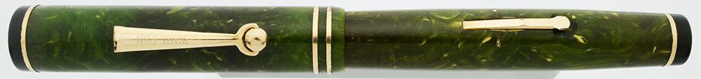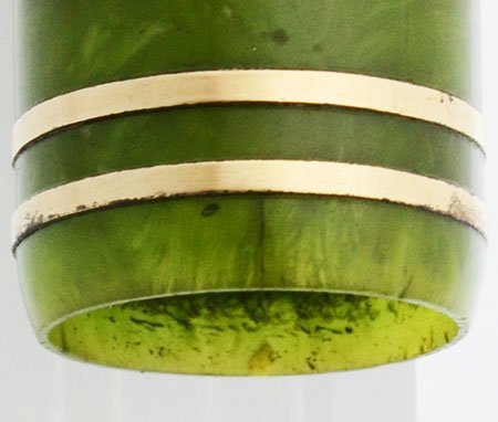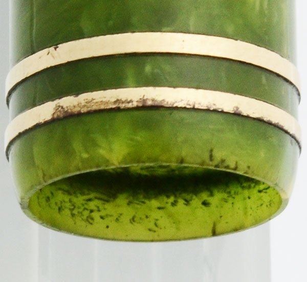 Color Jade green celluloid with black end pieces and gold filled trim. Cap has two gold bands.