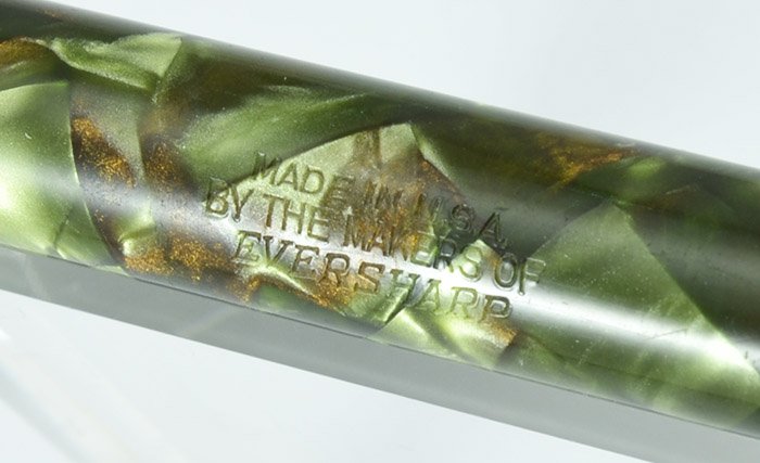 Condition Excellent condition. No cracks or chips, dings, dents, or personalization. There's some subtle plating wear on the lever and the clip, and a few very small light scratches on the cap and barrel. The imprint is very crips and readable, and the color is lovely, it doesn't look like it has faded at all. The pen has been fully restored and it's working very well.