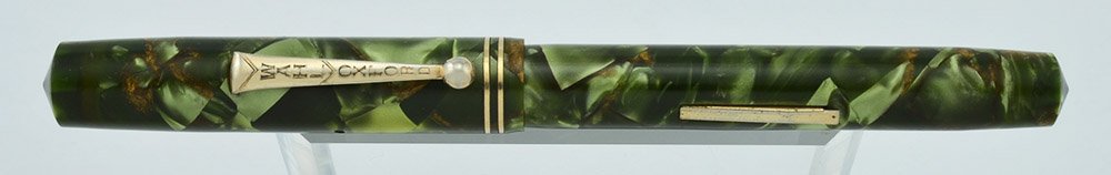 Color Green and bronze marbled cap and barrel with gold plated trim, thin double cap bands, and the earlier style clip which is attached just above the halfway point on the cap.