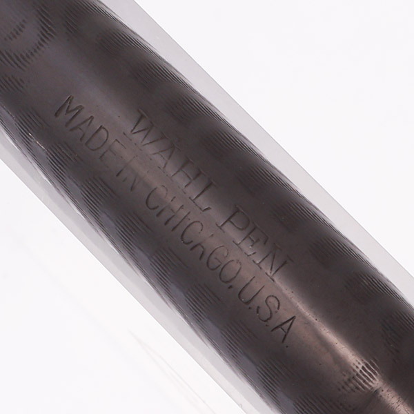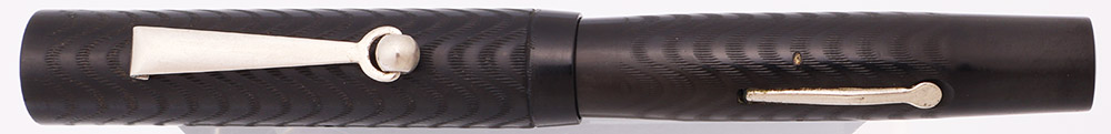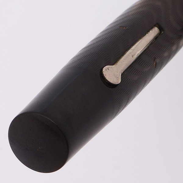 Condition Excellent + condition with no cracks, chips, dents, or dings. This is a very small, dark, and shiny vintage pen. The color is very dark, only slightly faded from the original velvety black. The chasing is excellent. The cap and barrel have very light scratching. The lever has light microscratching and a bit of plating wear on the very top. The clip has a light layer of microscratching. The imprints are clear.