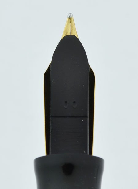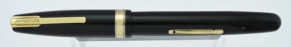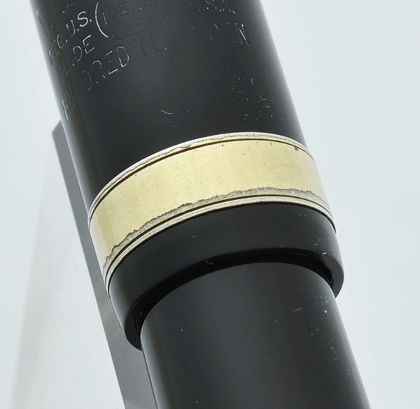 Condition Excellent condition, though there is some brassing on the trim. The plating has worn along the edges of the cap band (see photos), and there's some brassing on the middle of the lever. There are some very small scratches on the barrel and cap, and a slight indent in the lower barrel from the cap being posted. The imprint on the cap is a bit worn (see photos), but still legible. The pen is really very striking, quite shiny, and the clip looks great with no plating wear to be seen. No cracks or chips.