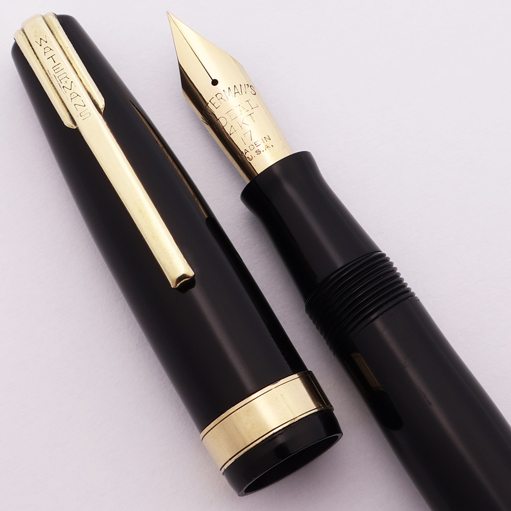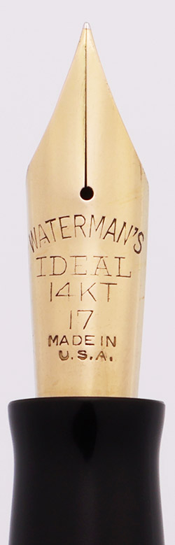 Nib EXTRA-FINE 14k gold Waterman's "17" Ideal nib. A little but of give, but no real flex or line variation. Excellent, large nib with good tipping.