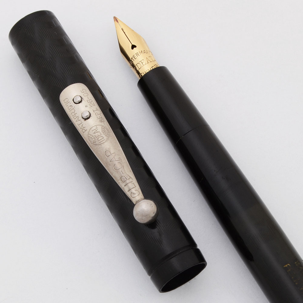 Nib FLEXIBLE FINE gold nib is marked "Waterman's Ideal New York." Please see the writing sample below. The point is fine which offers very strong contrast to the flexed lines of the pen. Line variation from fine to a wide broad. We consider it full flex.