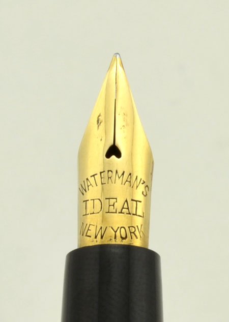 | Nib | The nib is marked Waterman Ideal New York (it's set deeply, but we can see a #2). It is fully flexible with a good ink flow ... and a lot of tipping material. The line varies from Extra Fine to Broad. (Not a wet noodle, but it flexes easily.) |