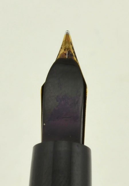 Excellent condition, though the color on the cap is a little faded. No cracks in the cap. Excellent readable imprints on barrel and barrel end. This pen writes very smoothly with an excellent amount of flex. The ink supply system is working well, and we'll guarantee it for a year. |