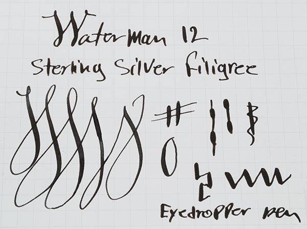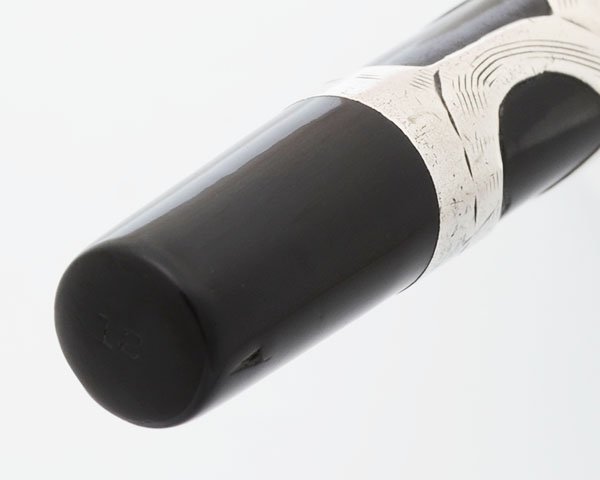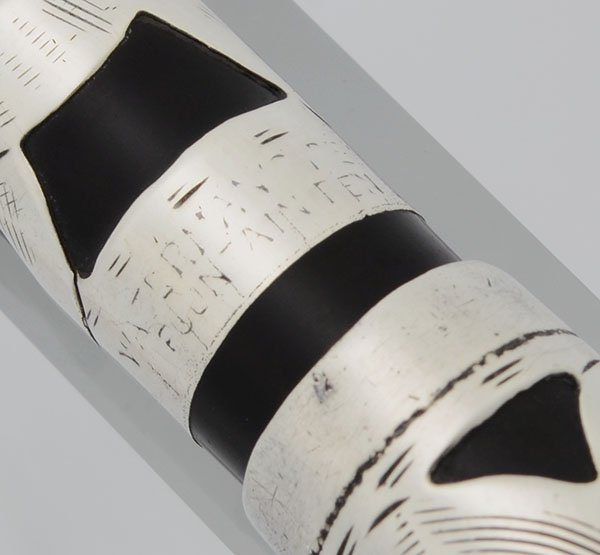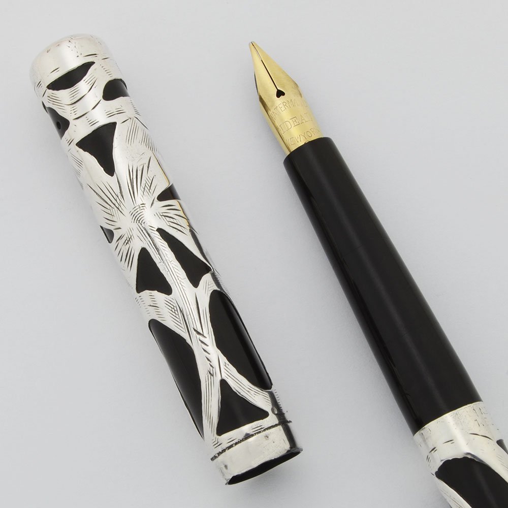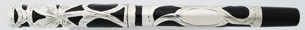Condition Excellent condition for this ornate, elegant and hard to find fountain pen. The silver filigree looks beautiful and is in excellent condition overall, though the bottom edge of the cap is a bit dinged up and there's a small chip of ebonite missing in the inside lip. The hard rubber on the cap and barrel has some fine scratching and some of the areas where it shows through have wear along the edges. The black endpiece has one deep scratch and a small chip along the bottom edge. The section, which is in two pieces, has capping marks and moderate to heavy scratching on the bottom piece and light scratching on the top piece. The top piece has a little "Y" shaped scratch. Even with the scratching, the section is shiny and the black color is vivid. The "12" imprint on the bottom end of the pen is clear. The Waterman imprint on the top of the barrel is sketchy (you can make it out but it is quite worn). No cracks.