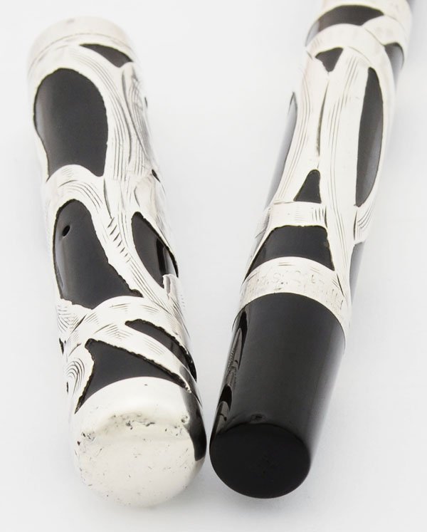 Color Black chased hard rubber covered with sterling silver floral filigree.