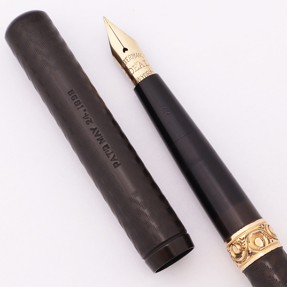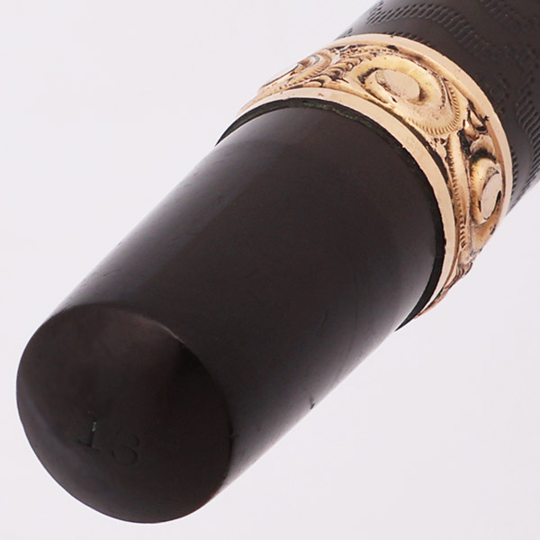 Condition Excellent condition for this very beautiful pen. The chasing on the cap and barrel are slightly worn, but still easily visible. The color of the hard rubber is slightly faded, and there's a clear difference between the color of the section and the rest of the pen. The section has scratching and there are some faint tool marks near the nib. The trim bands have spots of plating wear throughout; the chasing pattern on the bands is still quite strong. The imprints are clear. There are no cracks, dings, serious scratches, or personalization.