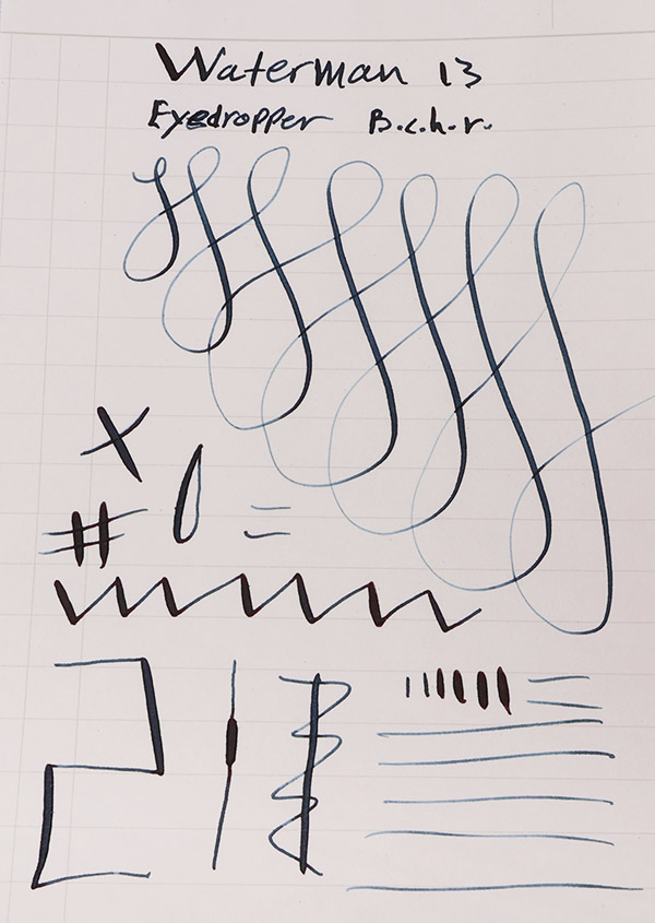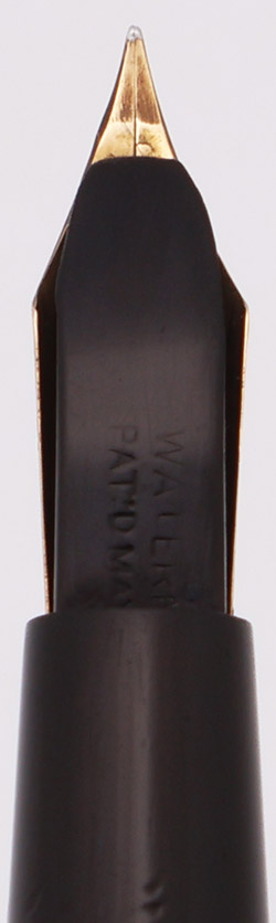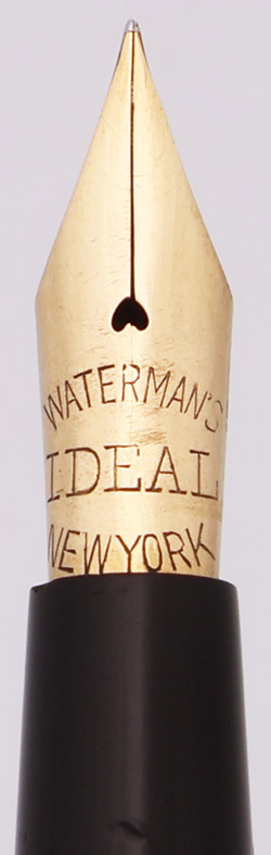 Nib FLEXIBLE FINE gold nib is marked "Waterman's Ideal New York 3." Please see the writing sample below. The point looks like a fine but the writing sample shows that extra fine hairlines are possible when using the pen. Very responsive with excellent springback. Line variation extra fine to broad.