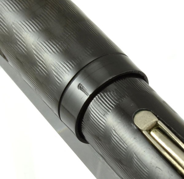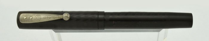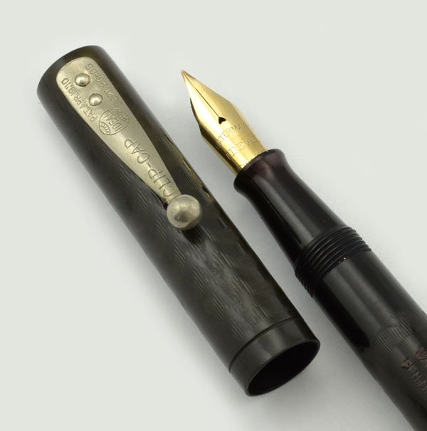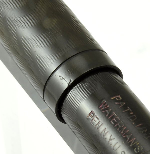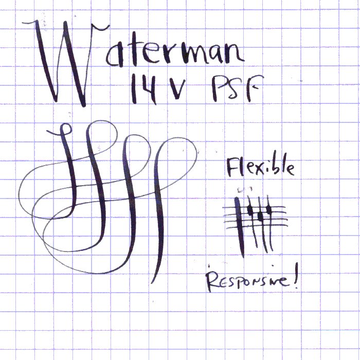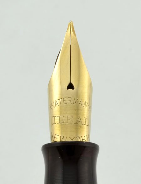 Nib The nib is marked Waterman Ideal New York (we can't see the nib number but it is larger than a #2 nib). It is nicely flexible with a controlled ink flow ... and a lot of tipping material. The line varies from fine to broad or double broad. There are two small pits on the top of the right tine, but it does not affect writing. Not quite full flex, but very good flex and very smooth with excellent spring back. Please see writing sample below.