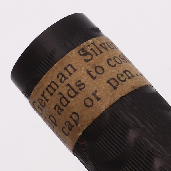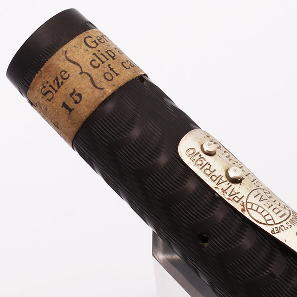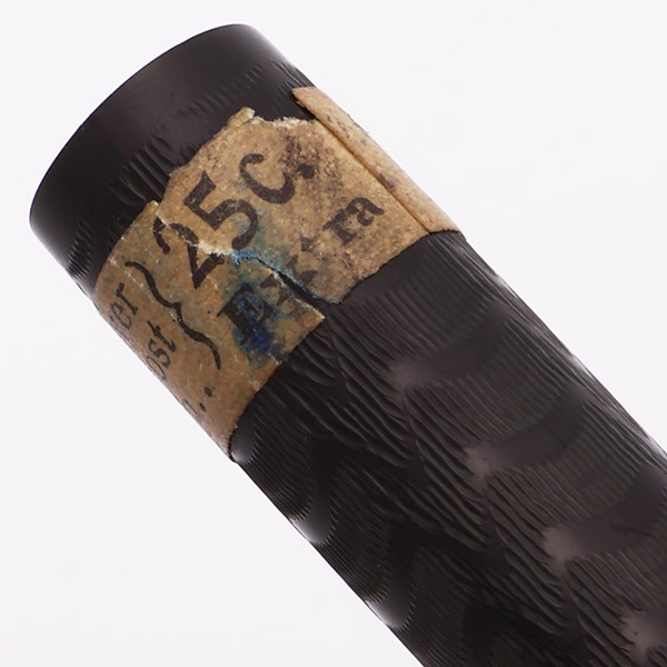 Condition Excellent + condition. It's a little lightened in color from exposure to sunlight, which you can certainly see in the difference between the barrel where it is covered by the cap and where it's not. No cracks or chips, just a few minor signs of usage. The chased pattern is crisp and the imprints are excellent on the clip and the barrel. It's a nice looking pen and it's working well.