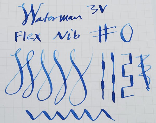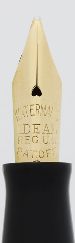 Nib MEDIUM FLEXIBLE 14k nib marked Waterman's Ideal #2 with a heart shaped breather hole. The tines spread very easily and the line variation is quite nice. See the writing sample below.