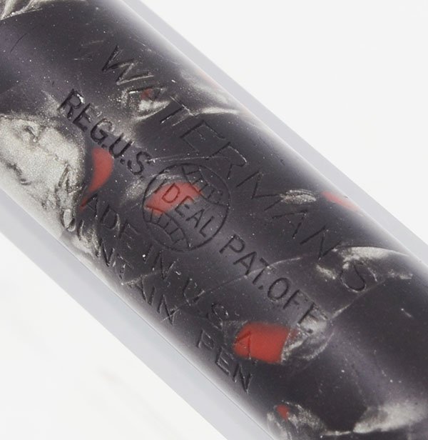 Color Marbled gray material with red flecks and nickel plated trim. It has an interesting clip that goes over the top of the cap.