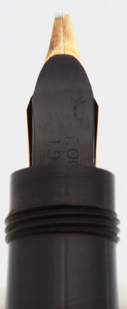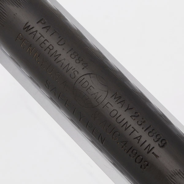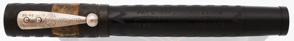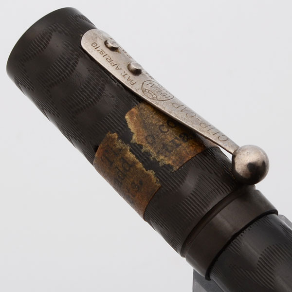Color Black chased hard rubber with steel clip. The cap has the original sticker on it.