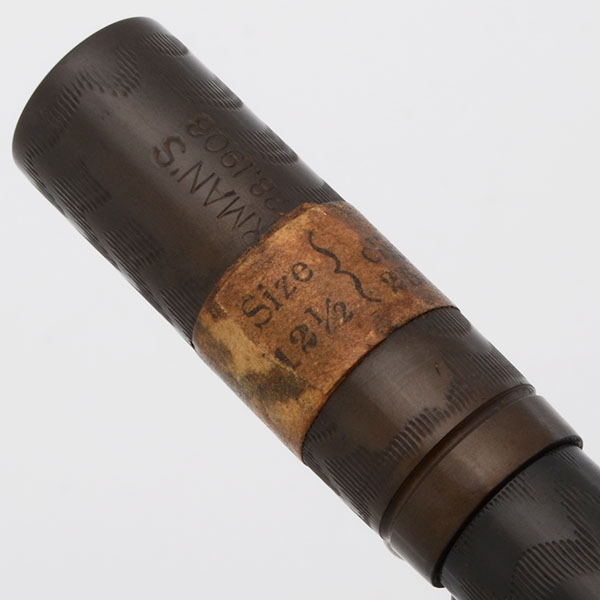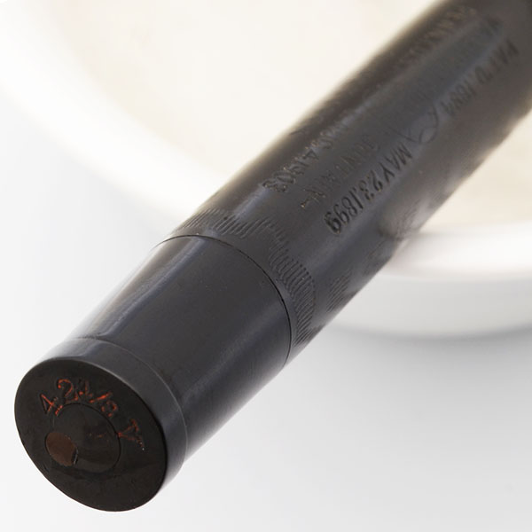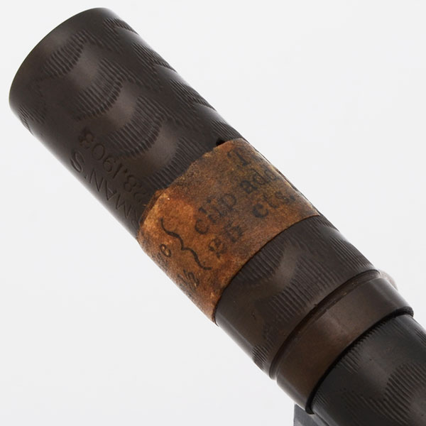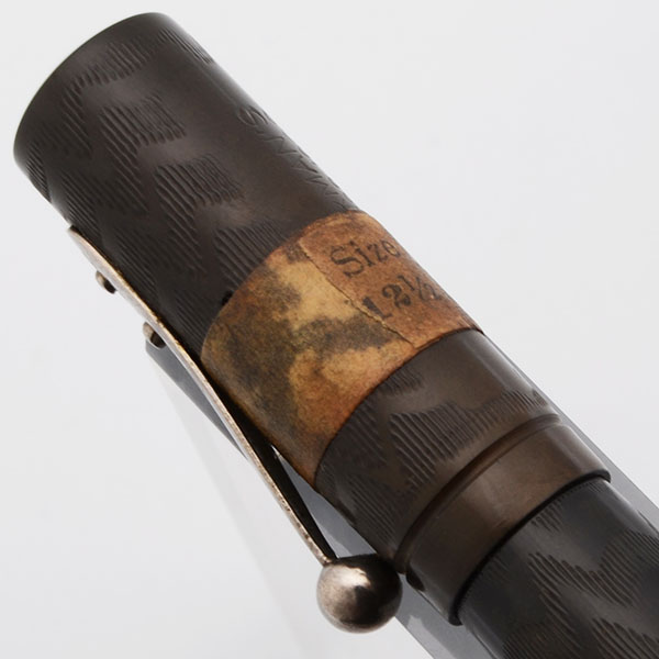 Condition Superior condition with no cracks, chips, dents, or dings. This is a small, dark, clearly chased pen in a classic safety pen design. The coloration on the barrel is excellent. The cap has faded to a dark chocolate brown and much of the cap is surrounded with the original description sticker. The clip has some plating wear. The barrel imprint is crystal clear. The 42-1/2V imprint at the end of the barrel is clear. The clip imprint is clear.